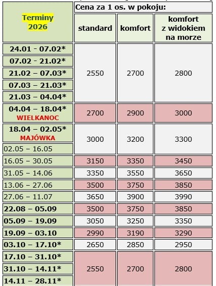 Aby zapobiec ewentualnym kosztom przy zwrocie wczasów spowodowanym chorobą lub wypadkiem losowym, prosimy o rozważenie wykupienia ubezpieczenia kosztów rezygnacji, które kosztuje 2,99% wartości imprezy w wariancie standard i 4,5% w wariancie z dodatkowym ryzykiem – nasileniem chorób przewlekłych.
