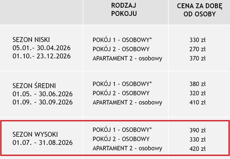 - dziecko 3-12 lat – 165 zł za dobę (nocleg + ½ wyżywienia)