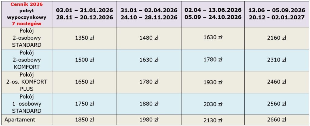 Cena za jedną osobę w pokoju dwuosobowym przy dwóch osobach pełnopłatnych. Zniżki dla dzieci w pokoju 2-os. komfort lub Komfort Plus i Apartamentach przysługują tylko przy min. 2 pełnopłatnych osobach. W przypadku pobytu 1 osoby dorosłej z dzieckiem, pobyt liczony jest jako 2 osoby dorosłe.