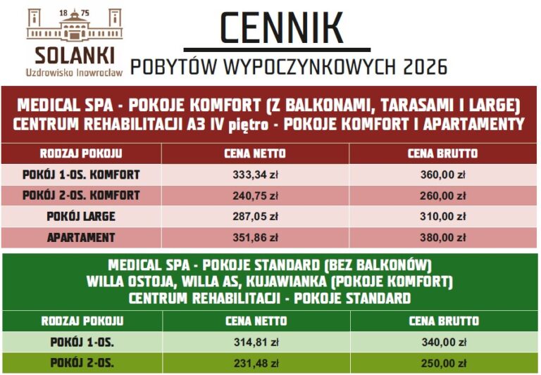 Zapraszamy w 2026 r na pobyty wypoczynkowe do Uzdrowiska Inowrocław Solanki. Pobyty (minimum 7 noclegów) z pełnym wyżywieniem i dostępem do strefy relaksu w cenie od 1750 zł/os przy zakwaterowaniu w pokoju 2 os. ( Willa „Ostoja”).