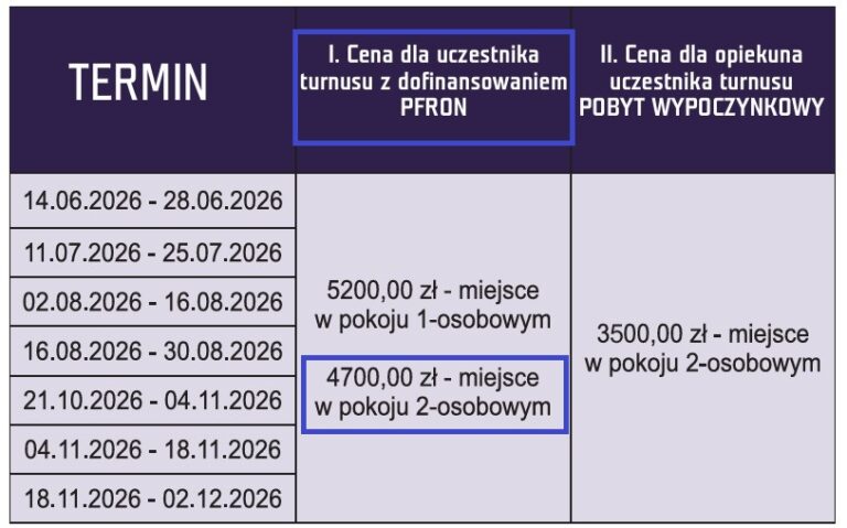 2026 – Turnusy rehabilitacyjne z możliwością dofinansowania PFRON