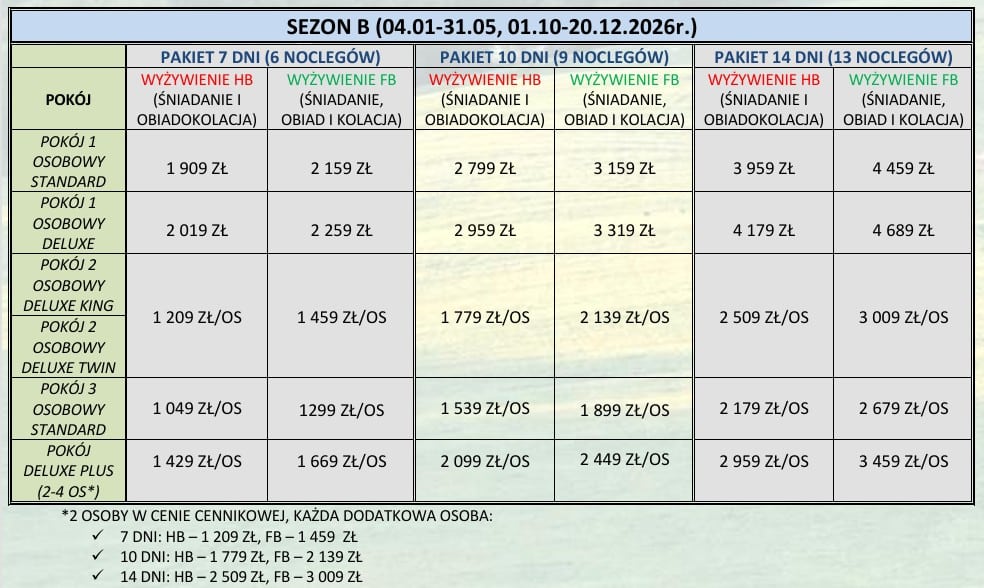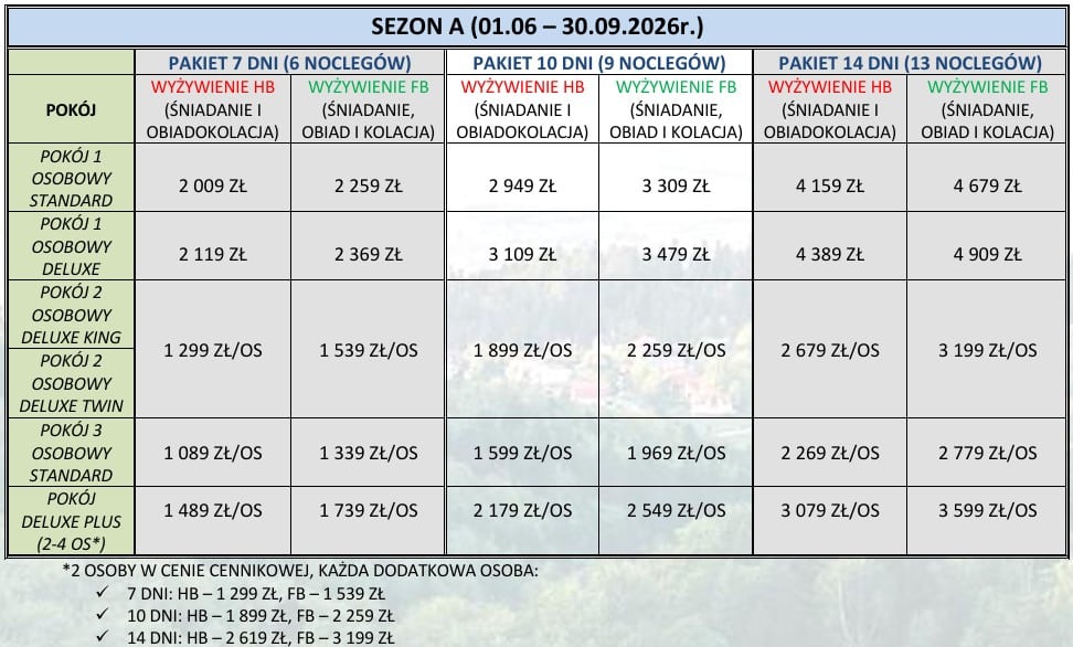 - Przedpłata nie podlega zwrotowi w przypadku rezygnacji w terminie krótszym niż 30 dni przed datą przyjazdu.