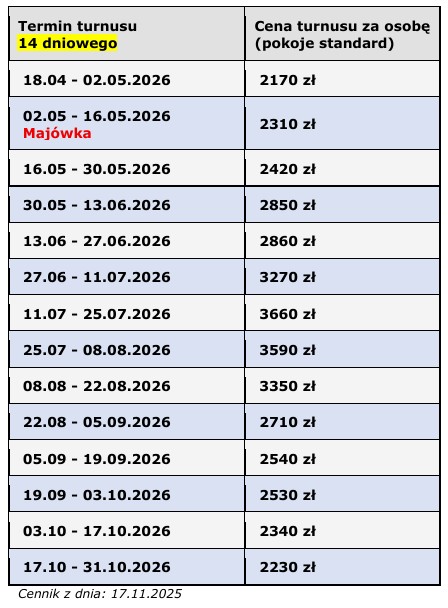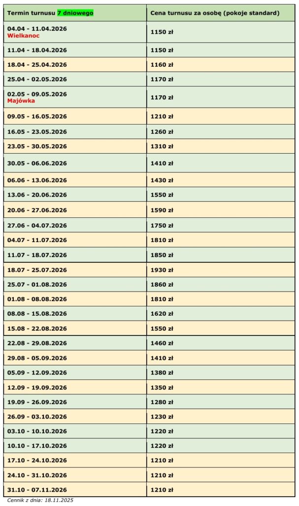 - ceny mogą ulec zmianie – obowiązują ceny z dnia rezerwacji