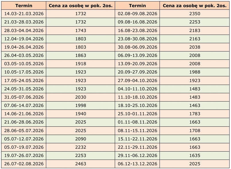 Cena 1 os/turnus 8 dni (7 noclegów). Pobyty obiadokolacji do śniadania