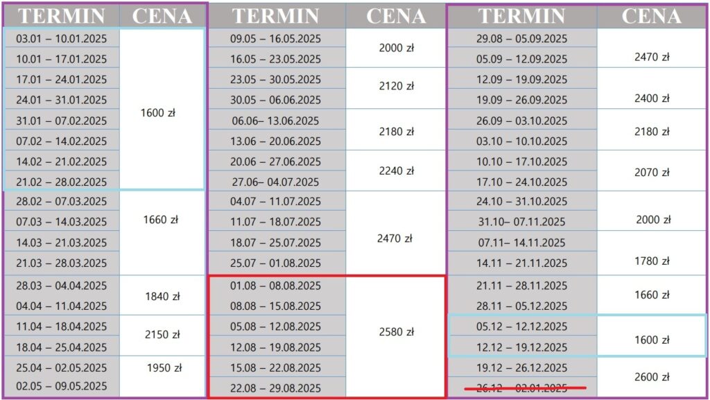 - dziecko do lat 3 – wspólne spanie, opłata stała 650 zł za 14 dni, 325 zł za 7 dni