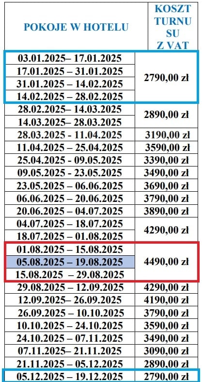 - ceny dotyczą zakwaterowania w pok. 2 i 3os. – dopłata do pokoju jednoosobowego (HOTEL) w turnusie :