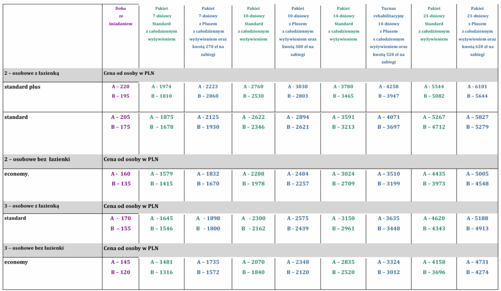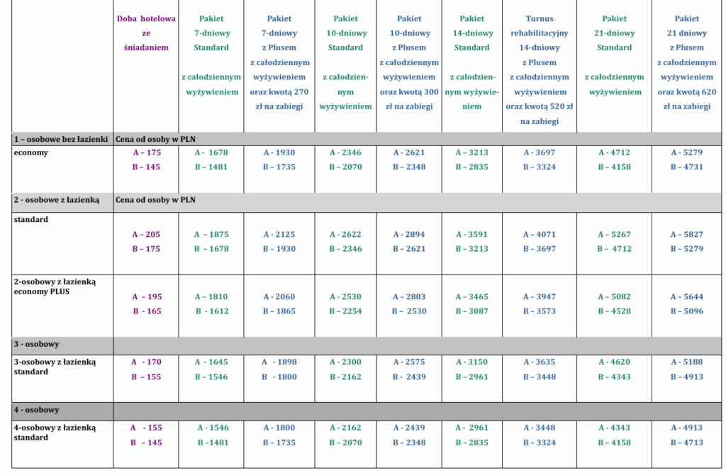 • z turnusów „z plusem” wyłączone są zabiegi: gabinetu masażu, łóżek rekondycyjnych, saun, kinesiotapingu oraz godziny z fizjoterapeutą „konsultacja terapeutyczna”. Wyłączone zabiegi są dodatkowo płatne po uzgodnieniu z działem planowania