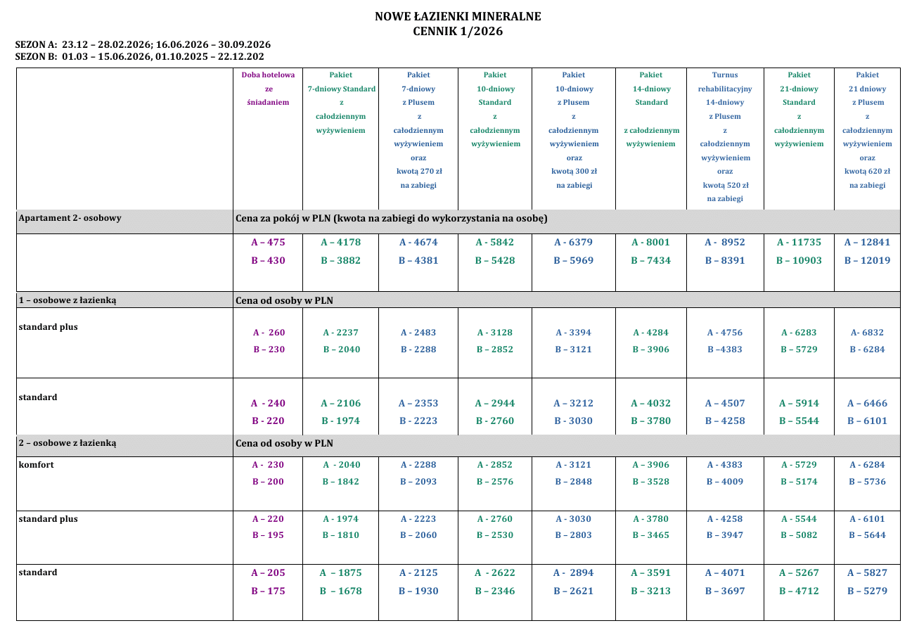 NOWE ŁAZIENKI MINERALNE – CENNIK 2025/2026 r – od 23.12.2025