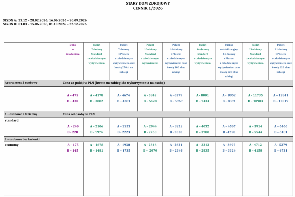 STARY DOM ZDROJOWY- CENNIK 2025/2026 r – od 23.12.2025
