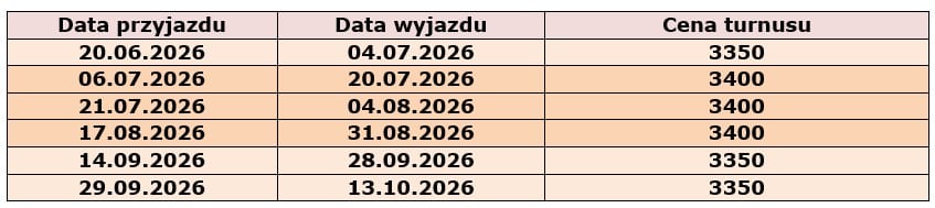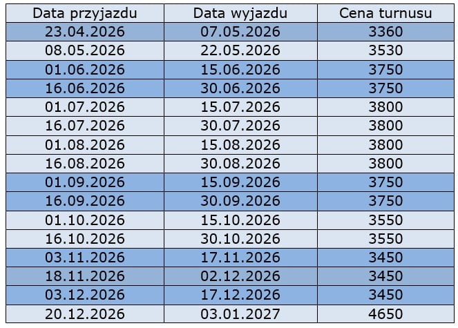 Aby zapobiec ewentualnym kosztom przy zwrocie wczasów spowodowanym chorobą lub wypadkiem losowym, prosimy o rozważenie wykupienia ubezpieczenia kosztów rezygnacji, które kosztuje 2,89% wartości imprezy w wariancie standard i 5,78% w wariancie z dodatkowym ryzykiem – chorobami przewlekłymi.