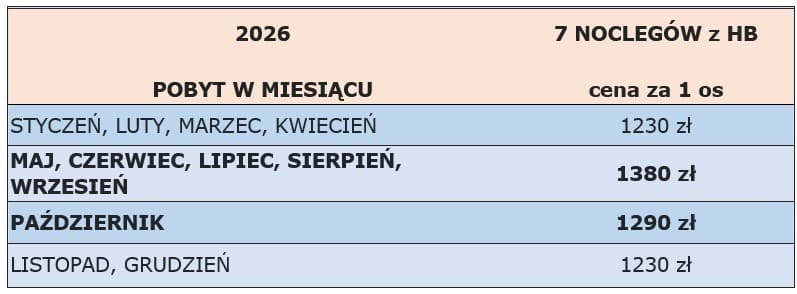 • wyżywienie 2 x dziennie od obiadokolacji w dniu przyjazdu do śniadania w dniu wyjazdu. Śniadania w formie szwedzkiego stołu + obiadokolacja serwowana (zupa + drugie danie, kawa i herbata)
