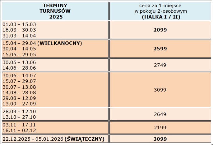 uzdrowiskowej ośrodku Halka. Cena za 14-dniowy turnus z 22 zabiegami w 2025r – od 2099 zł/os w sezonie niskim do 3099 zł w szczycie sezonu. Dostępne są także Wczasowe turnusy świąteczno-sylwestrowe (7 i 10 noclegów).