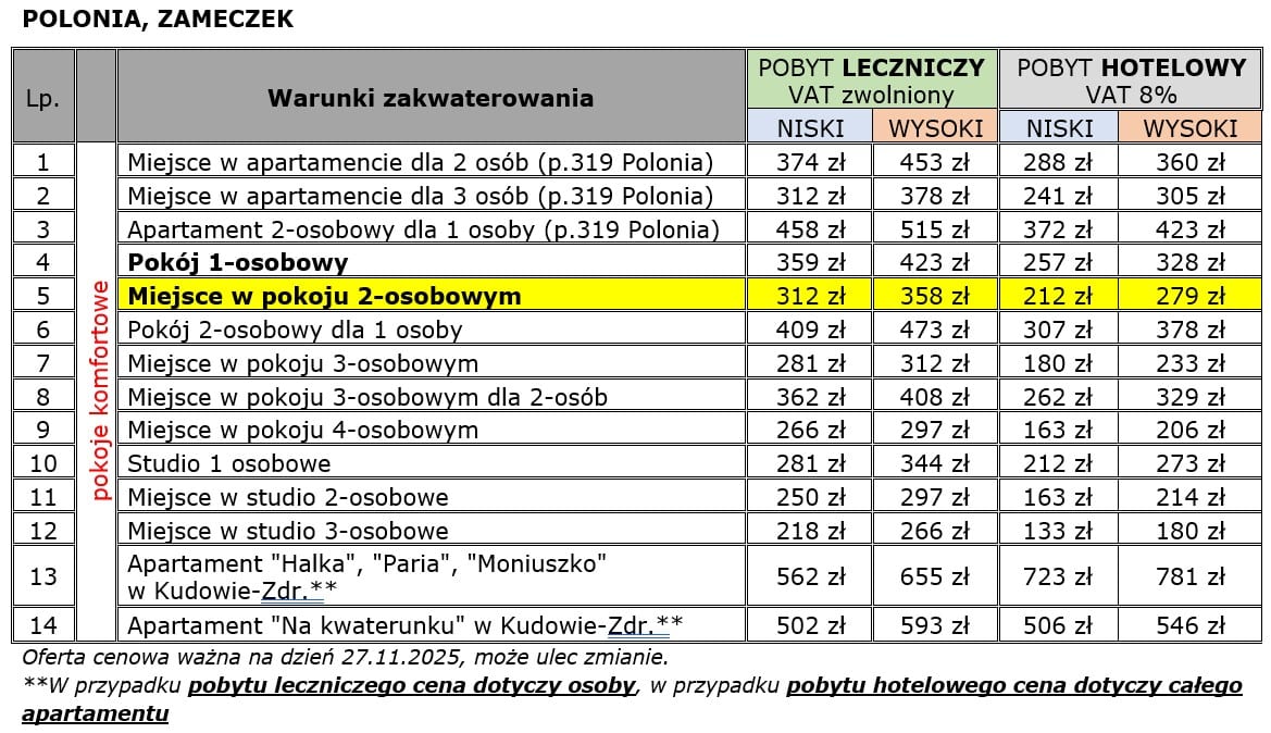 Sanatoria: Polonia oraz Zameczek zapraszają na pobyty lecznicze do uzdrowiska Kudowa Zdrój. Ceny tygodniowego pobytu z zabiegami, w zależności od sezonu, obiektu, rodzaju i standardu pokoju w 2026 r, od 1526 zł/os. w pok. 3 os. studio, sezon niski, pobyt leczniczy).