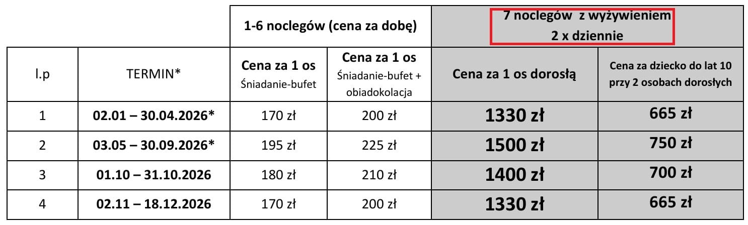 1330 zł/os w sezonie niskim, przy zakwaterowaniu w pokoju 2 os. Dostępne także krótsze pobyty. Oferty