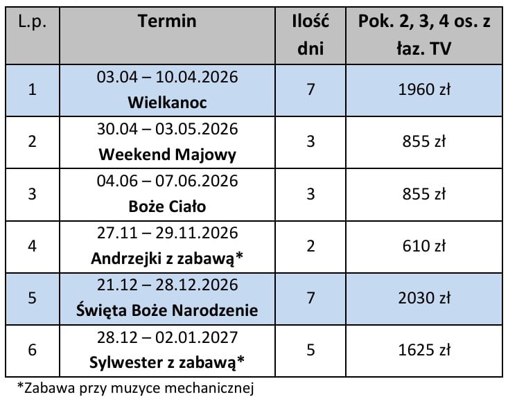 specjalne: WIELKANOC – 7 dni – 1960 zł/os ; MAJÓWKA – 4 dni – 855 zł/os.