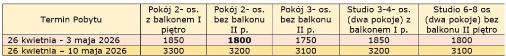 - Noclegi w pokojach wg wcześniejszych ustaleń w procesie rezerwacji