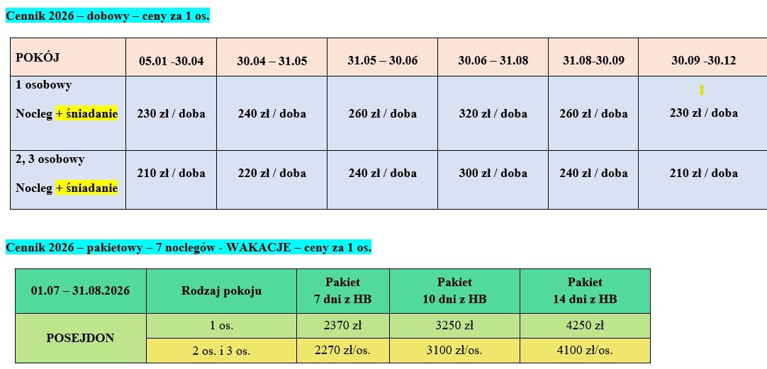 - obiadokolacja w cenie 60 zł (serwowane w jadalni DW Posejdon)