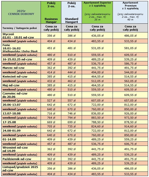 Tydzień = 5 x cena niedziela-czwartek + 2 x cena weekend (piątek-sobota)