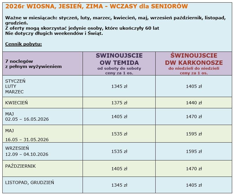 TURNUSY DLA SENIORÓW W ŚWINOUJŚCIU. Zapraszamy w 2026r do aktywnego wypoczynku w obiektach OW Temida oraz DW Karkonosze. W cenie: domowe wyżywienie 3 x dziennie, dostęp do WiFi, atrakcje. Pobyty 7 noclegów z pełnym wyżywieniem w cenie od 1345 zł/os (w sezonie niskim-styczeń, luty, marzec), przy zakwaterowaniu w pokoju 2 os. Blisko wejścia na plażę, położenie w spokojnej dzielnicy wypoczynkowo-sanatoryjnej.