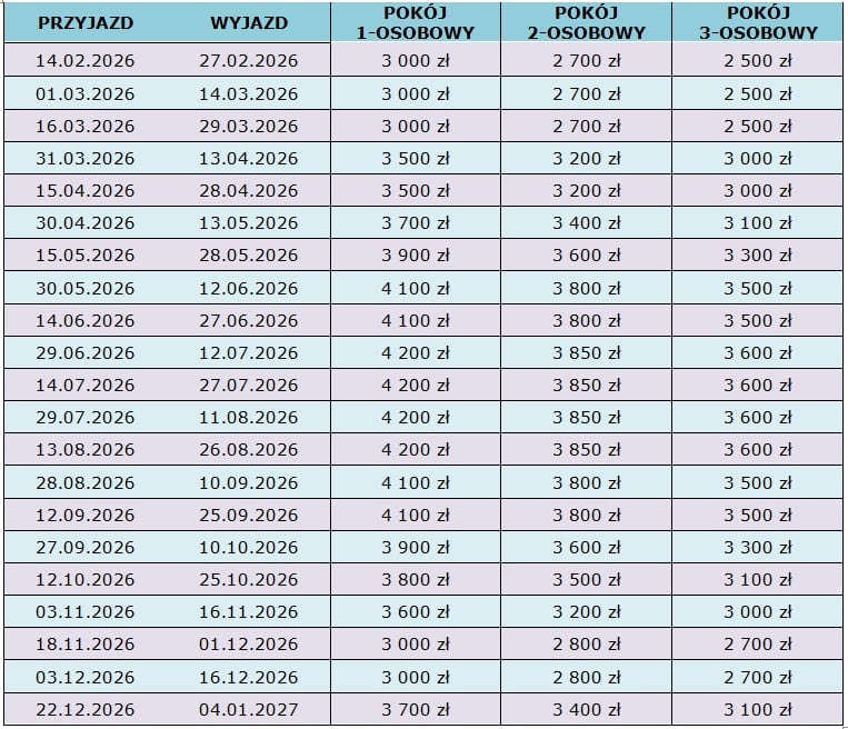 Aby zapobiec ewentualnym kosztom przy zwrocie wczasów spowodowanym chorobą lub wypadkiem losowym, prosimy o rozważenie wykupienia ubezpieczenia kosztów rezygnacji, które kosztuje 2,89% wartości imprezy w wariancie standard i 5,78% w wariancie z dodatkowym ryzykiem – chorobami przewlekłymi.