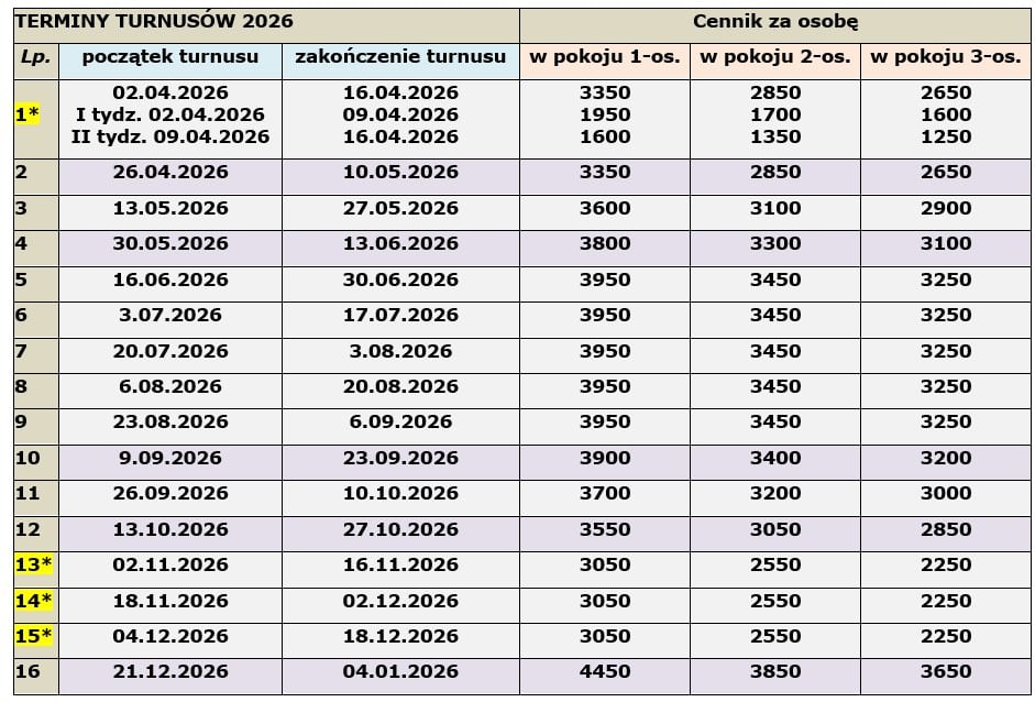 W terminach oznaczonych * możliwe turnusy 7-dniowe