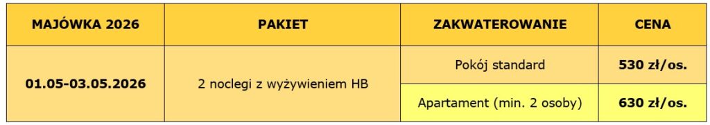 MAJÓWKA 2026 – pakiet 2 noclegi z wyżywieniem 2x dziennie (HB)