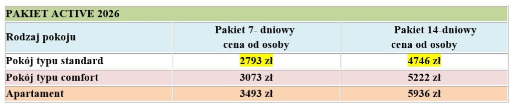 Cennik 2026 – ACTIVE – Turnusy z dietą strukturalną – ceny za 1 os.