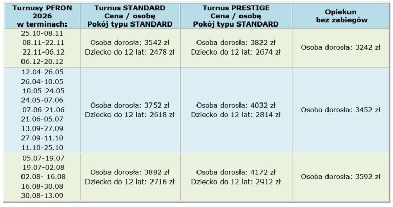 Cennik 2026 – PFRON – TURNUSY REHABILITACYJNE – Ceny za 1 os.