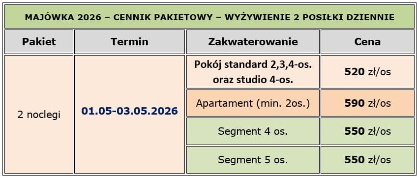 MAJÓWKA 2026 – Ośrodek Wypoczynkowy „KORAB” w Ustroniu Morskim (około 14km od Kołobrzegu) zaprasza na solidny wypoczynek nad morzem. Obiekt wybudowany w 2011r. Pobyt 2 noclegi w terminie: 01.05 – 03.05.2026 – w cenie od 520 zł/os. z wyżywieniem HB (2 posiłki dziennie) W obiekcie dwa tartanowe boiska do gry w koszykówkę i siatkówkę. Dostępne też pobyty w segmentach 4-5 osobowych.