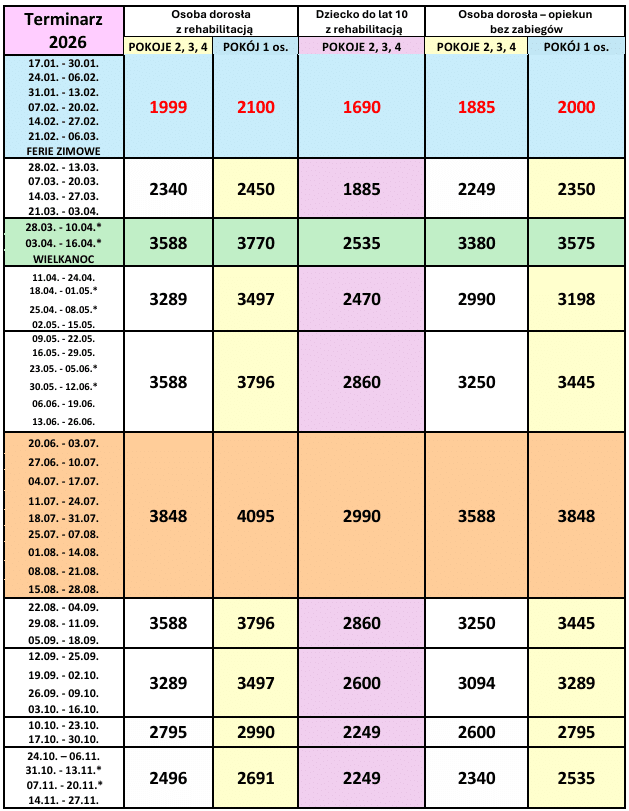 2026r – Cennik 14 dniowych turnusów rehabilitacyjnych