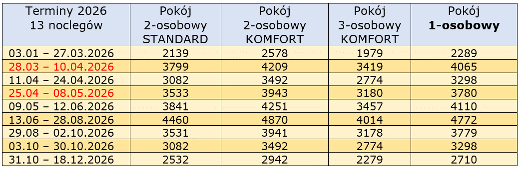 Cennik z wyłączeniem świąt i długich weekendów: j. 18.04-21.04.25, 1.05-4.05.25, 19.06-22.06.25, 15.08-17.08.25, 29.11-1.12.25)