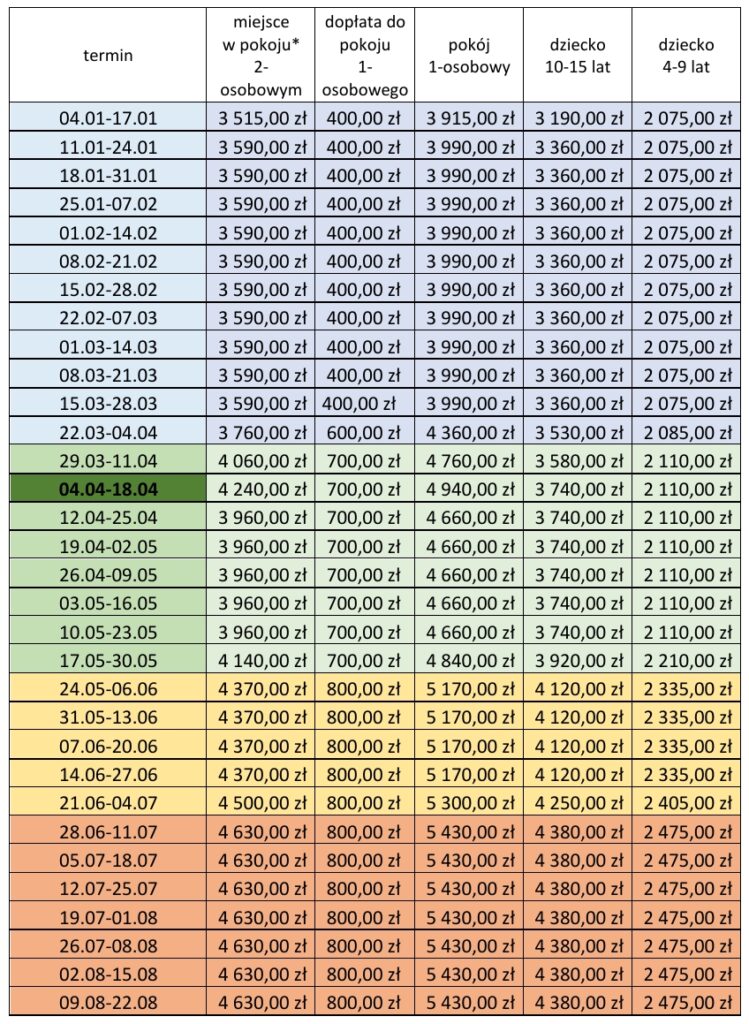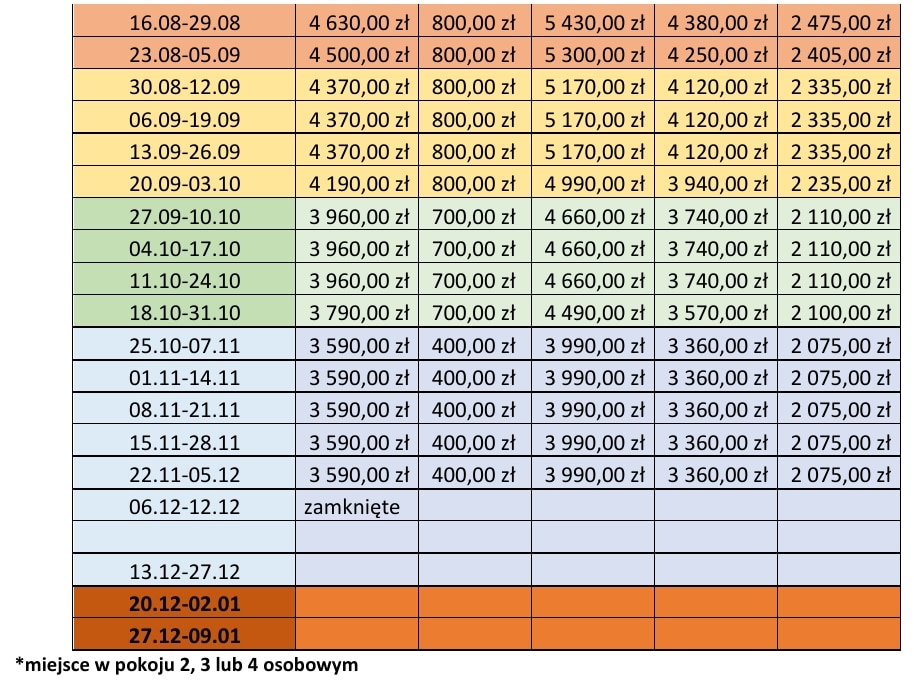 - pobyty obejmujące Wielkanoc, Boże Narodzenie i Sylwestra – sezon wysoki