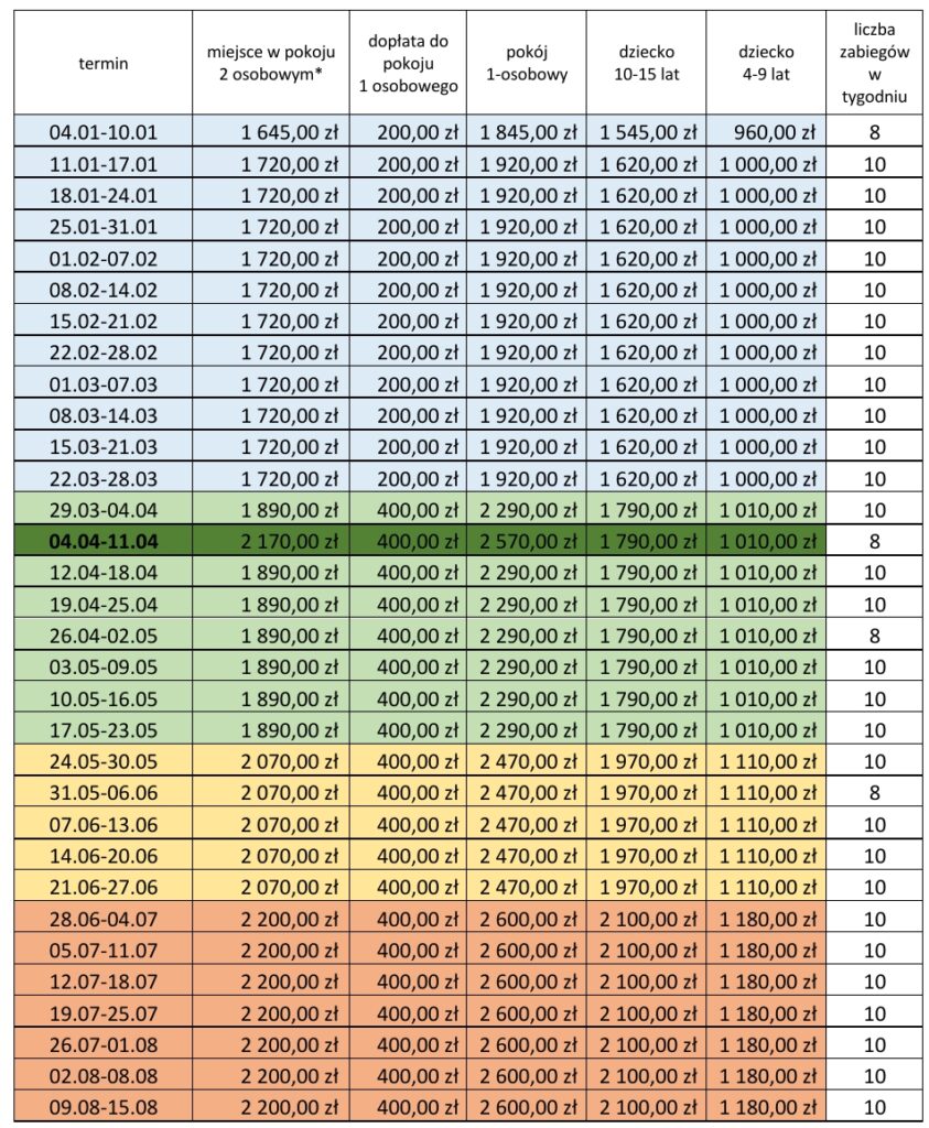 - 10 – 15 lat (pełne wyżywienie, bez zabiegów)