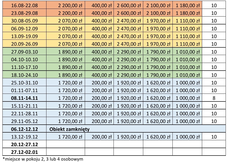 - sezon niski (listopad-marzec): 150 zł/osoba dorosła, 120 zł/dziecko 10-15 lat, 75 zł dziecko 4-9 lat