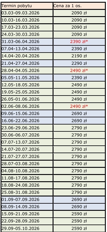 Aby zapobiec ewentualnym kosztom przy zwrocie wczasów spowodowanym chorobą lub wypadkiem losowym, prosimy o rozważenie wykupienia ubezpieczenia kosztów rezygnacji, które kosztuje 2,89% wartości imprezy w wariancie standard i 5,78% w wariancie z dodatkowym ryzykiem – chorobami przewlekłymi.