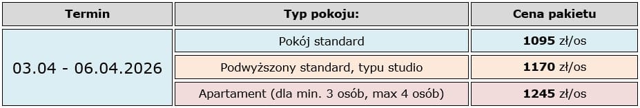 - W przypadku zakwaterowania w pokoju mniejszej liczby osób niż wymagane minimum (np. 2 osób w pokoju 4os.) dopłata 10% ceny pakietu za każde niewykorzystane miejsce